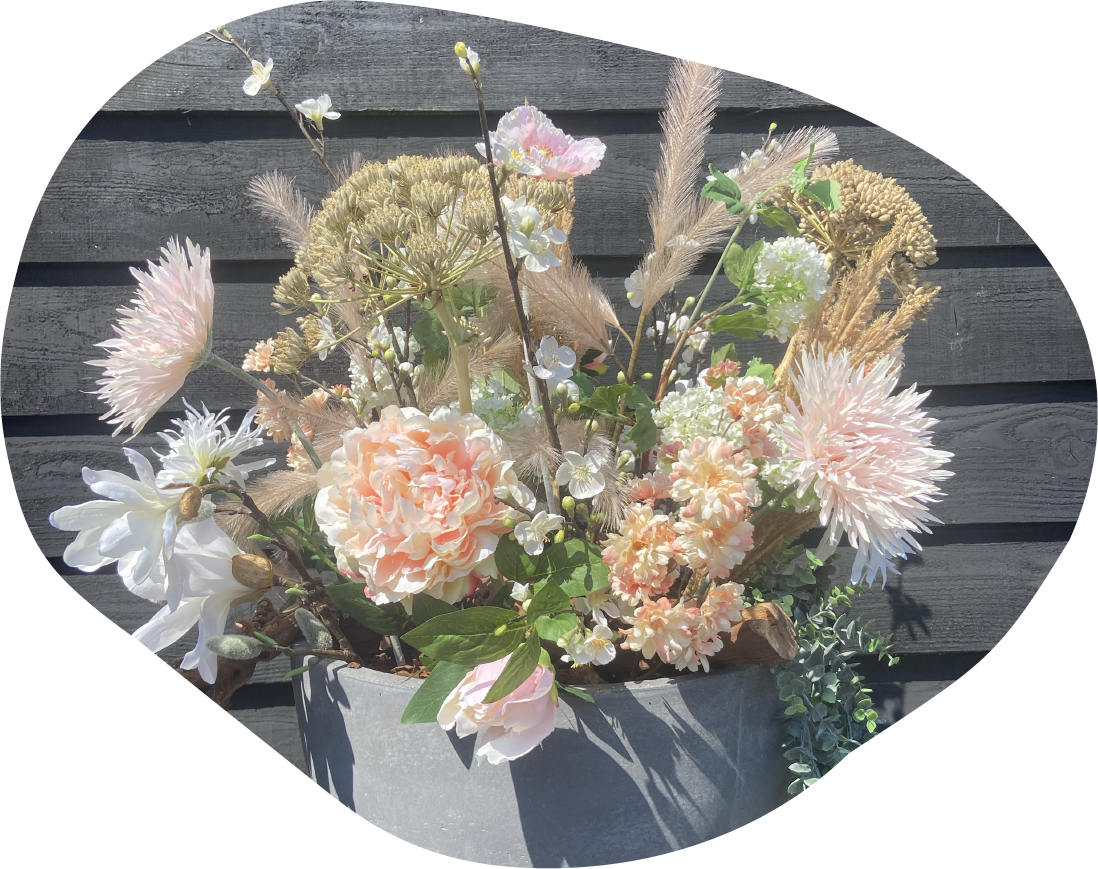 Maar ook voor in huis, creëren wij zijde arrangementen, die aansluiten bij uw interieur. Zodat u kunt genieten van blijvende, onderhoudsarme bloemenpracht, bij uw thuis.